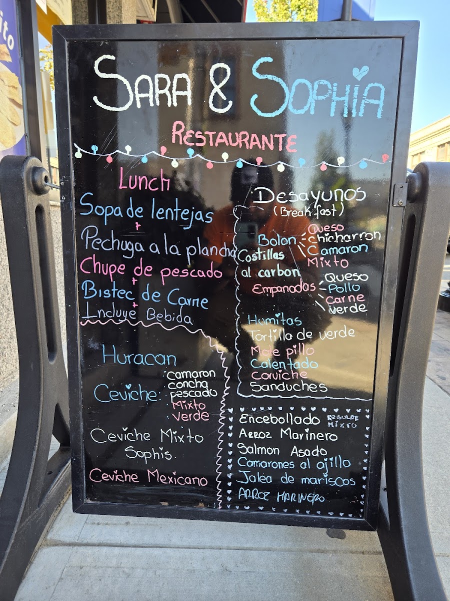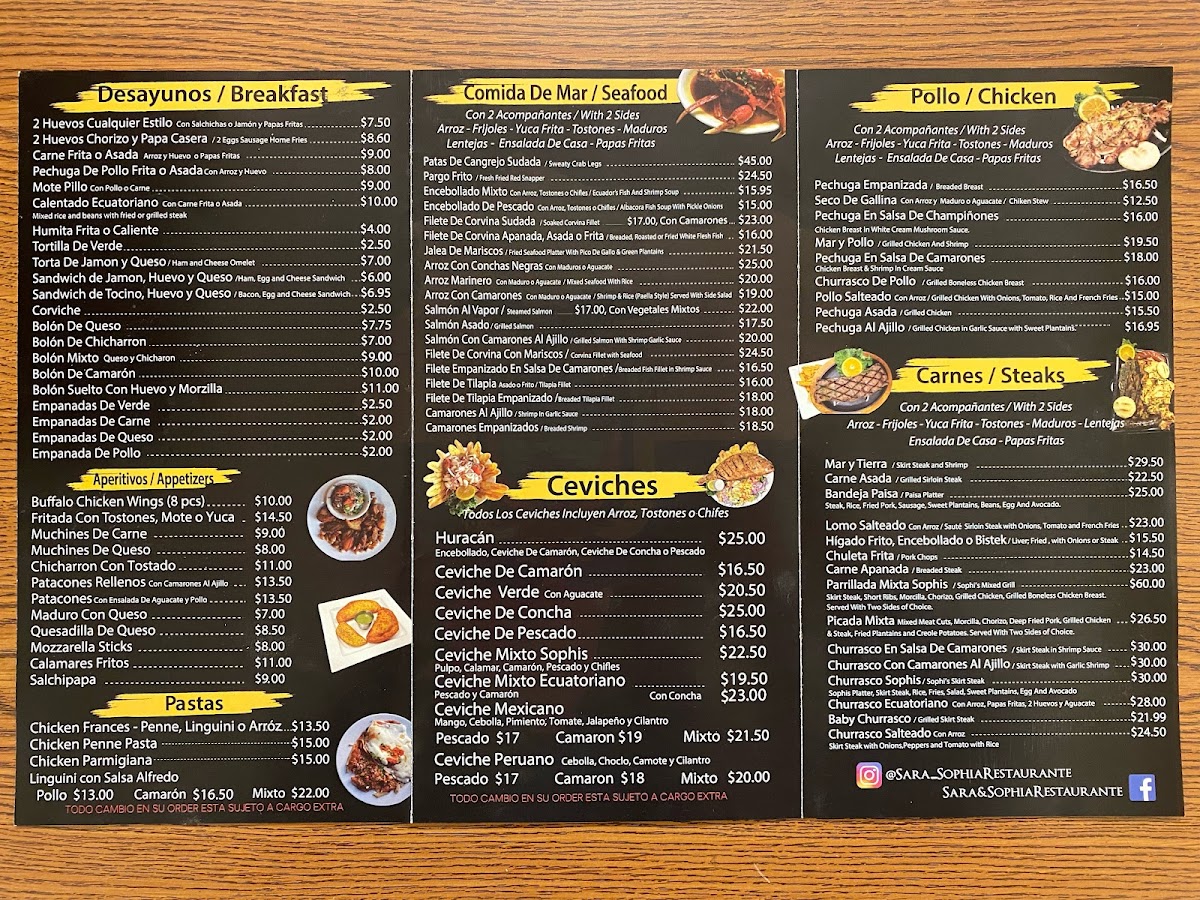 Mango, choclo, camote y cilantro. Todos los ceviches incluyen arroz, tostones o chifes. / Mango, corn, sweet potato and cilantro. All ceviches include rice, fried plantains or chips.