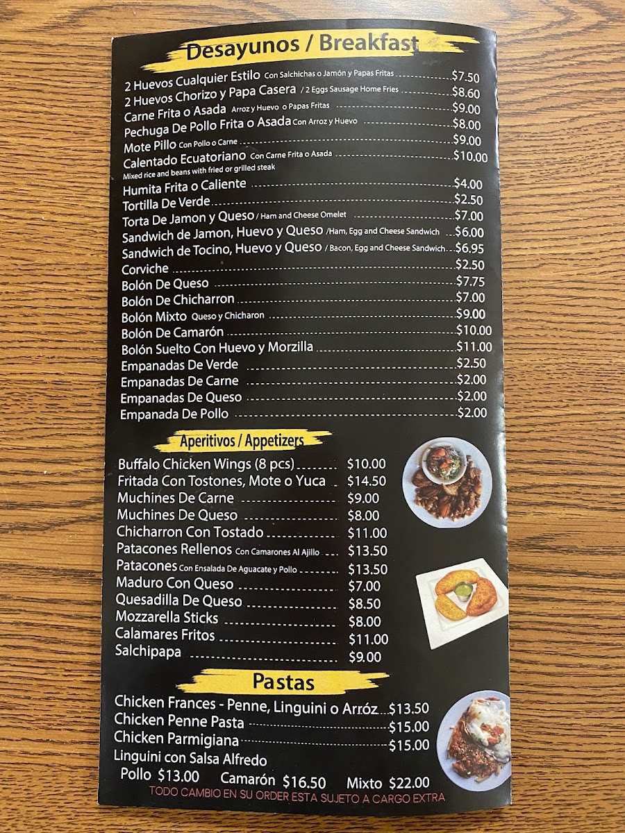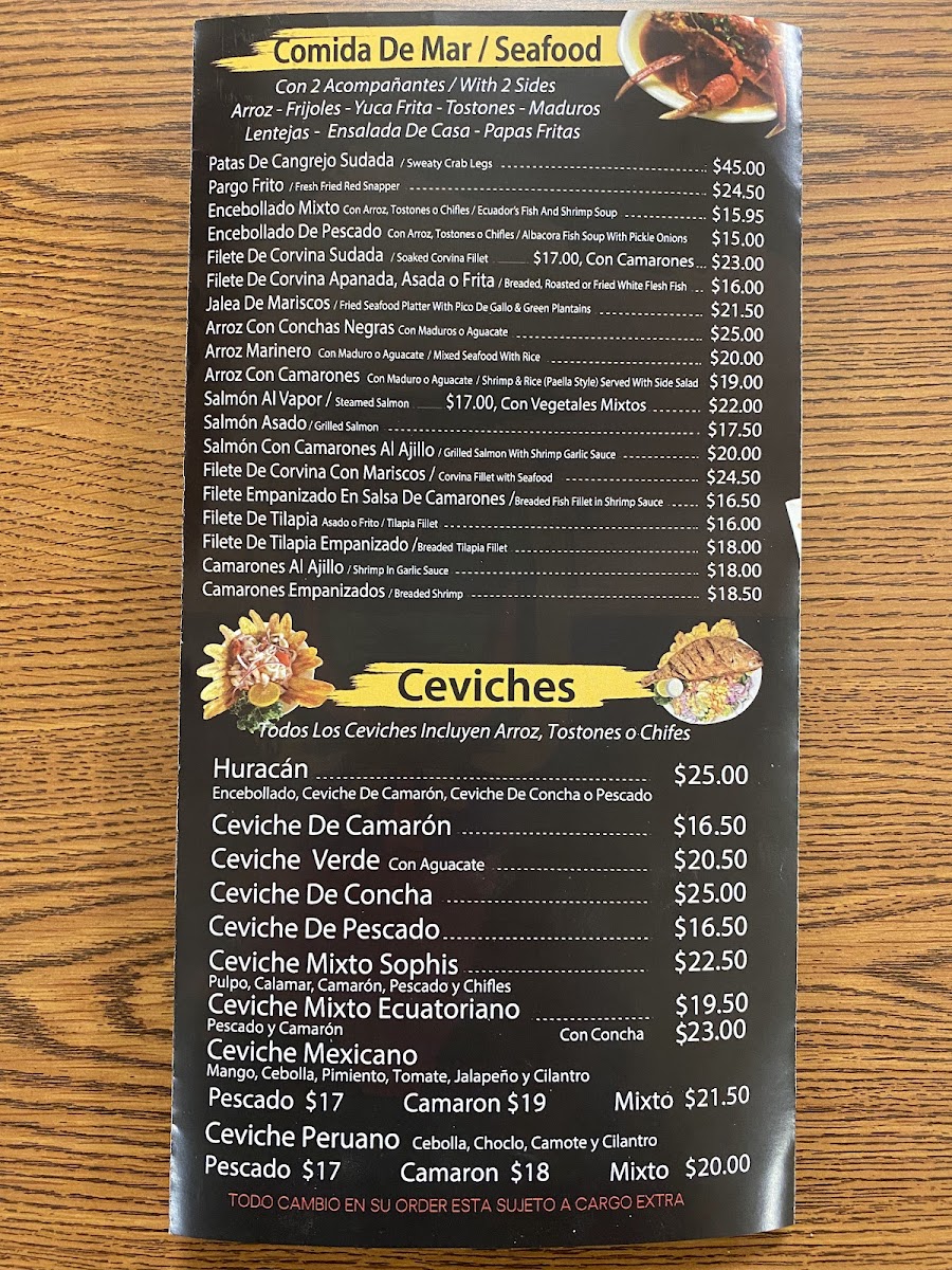 Mango, cebolla, pimiento, tomate, jalapeño y cilantro. Todos los ceviches incluyen arroz, tostones o chifes. / Mango, onion, bell pepper, tomato, jalapeño and cilantro. All ceviches include rice, fried plantains or chips.